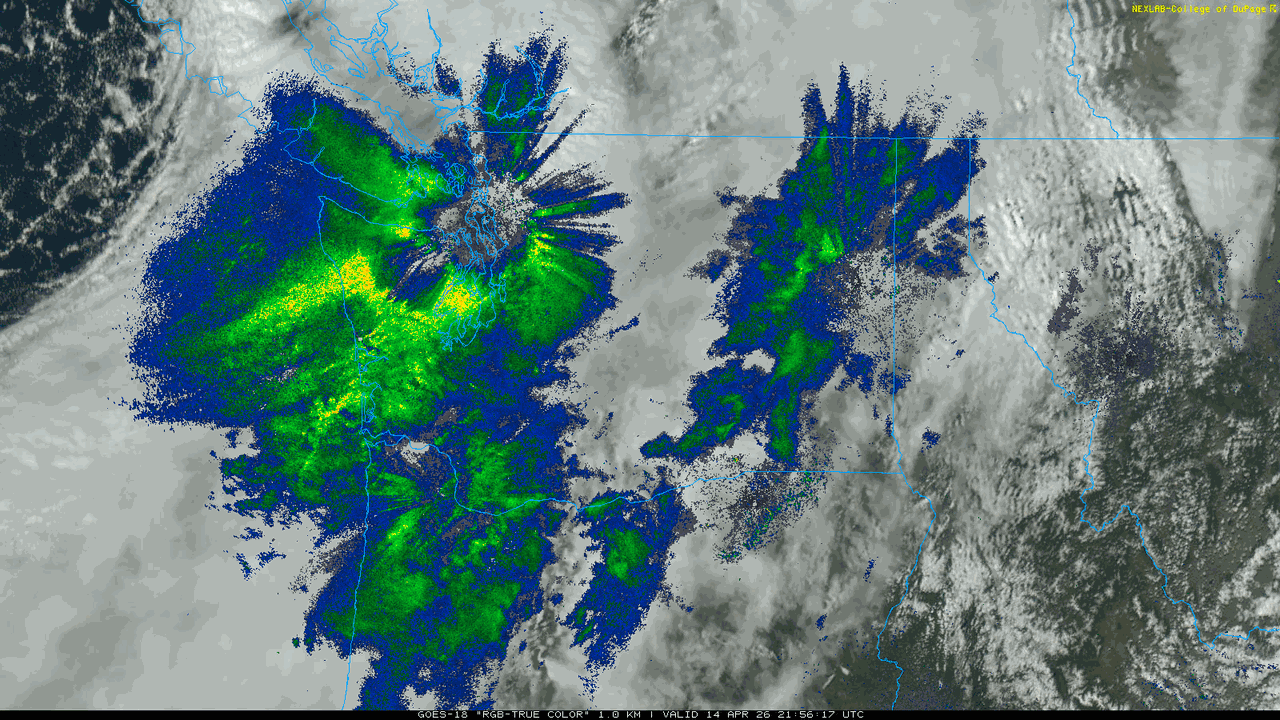 Integrated GOES true color and radar loop for the Pacific Northwest. Updated every 2 hours.