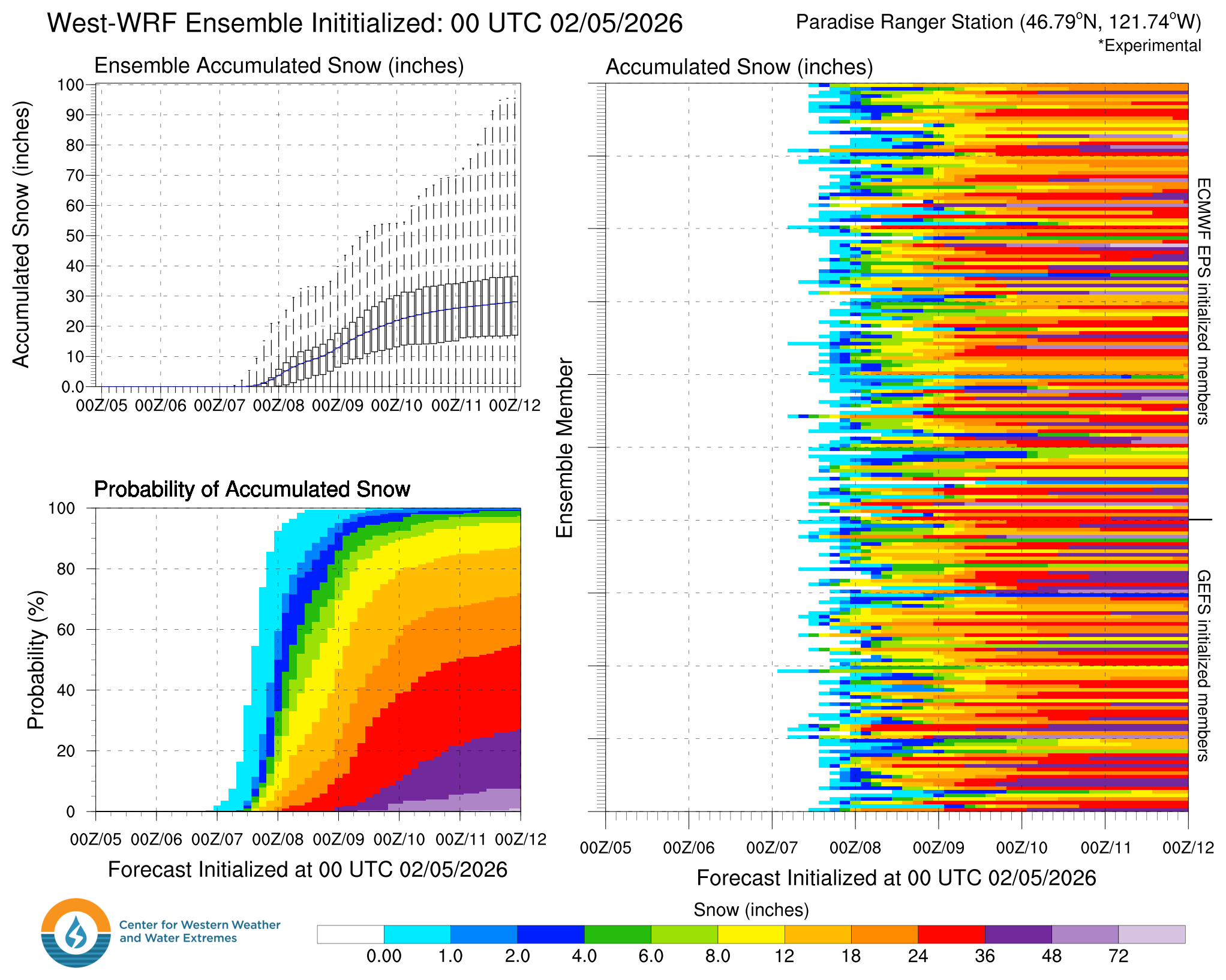 For example, the West-WRF model's 7-day snowfall forecast for Paradise ranges from 4 inches to 100 inches.