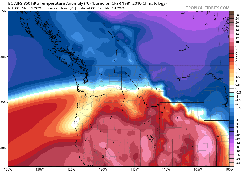 So so good. This may be the greatest short-term forecast I've ever written for Cascade Mountain Weather. Remnant moisture from a weak atmospheric river is riding above a ridge of high pressure centered off the coast of Central California. Coupled with this feature is a strong jet streak (region of elevated winds within the jet stream) in the upper atmosphere. A little bit of chicken vs. egg here but the jet streak is associated with a very strong north-south temperature gradient. See the plot below for the gradient in temperature anomaly at roughly 5000ft in the atmosphere. In Northern WA, temperatures Friday afternoon will be running 5C/10F below normal while Southern Oregon is nearly 10C/20F above normal, lucky us!!