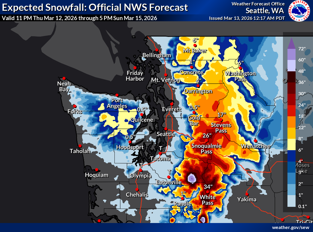 Last weekend brought significant rain to our beloved Cascade Mountains, decimating low elevation snow even further. However, everything changed Sunday night as a cold front swept through, ushering in freezing levels well below pass levels. A Puget Sound Convergence Zone (PSGZ) band of precipitation set up with the firehouse aimed squarely at Stevens Pass, which received over 20" of snow by Monday afternoon. Nearly all mountain locations across Western Washington have picked up significant snowfall. Some notable improvements to settled snow depth since last weekend include +42" at Stevens Pass (mid-mountain), +27" at Alpental (mid-mountain), and +33" at Paradise. And this does not even include Thursday night and Friday's bonus snow!!