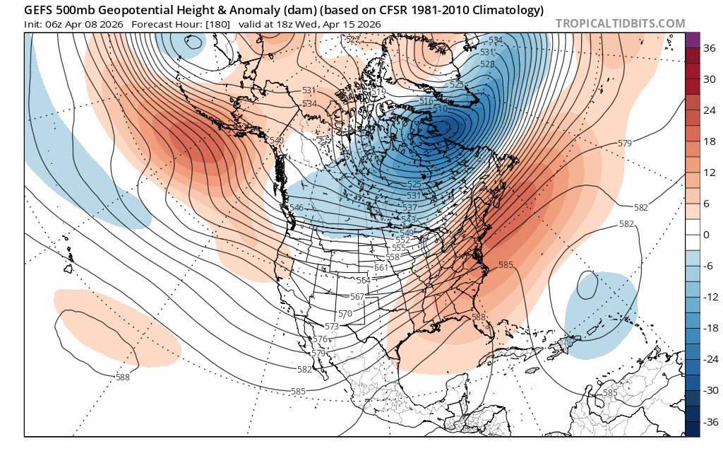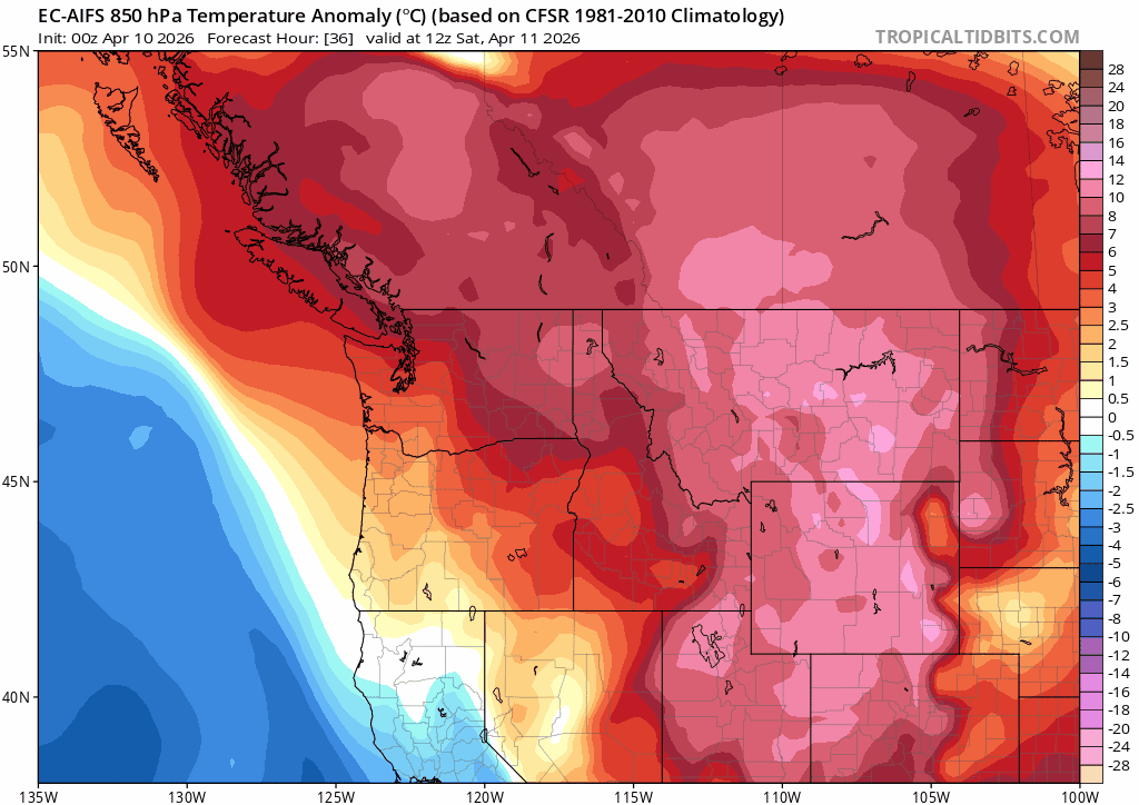 Just kidding. Please do not use individual coarse weather models 16 days out for anything other than wishcasting and other shenanigans. In more real news, both the GEFS and EPS are keen on persistent troughing over the PNW around April 19-21. This is not "snowing in Seattle" cold but if it comes with a decent bit of moisture, we could be looking at yet another April pow day for many mid elevation sites. The NOAA Climate Prediction Center agrees with this assessment, giving us above average odds at cooler than normal weather in the 8-14 day range.