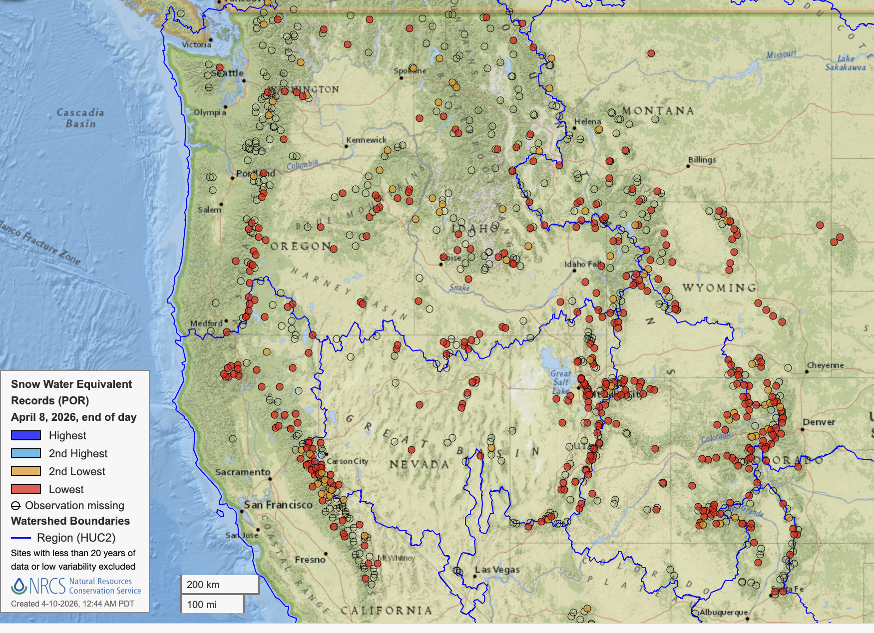 All the red dots in this image are SNOTEL sites at RECORD LOW snow water equivalent for the date. This includes